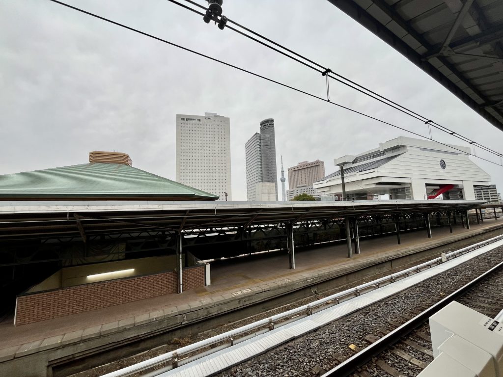 JR総武線の両国駅のホームからNTTドコモ墨田ビルを撮りました。左は両国国技館、右は江戸東京博物館です。